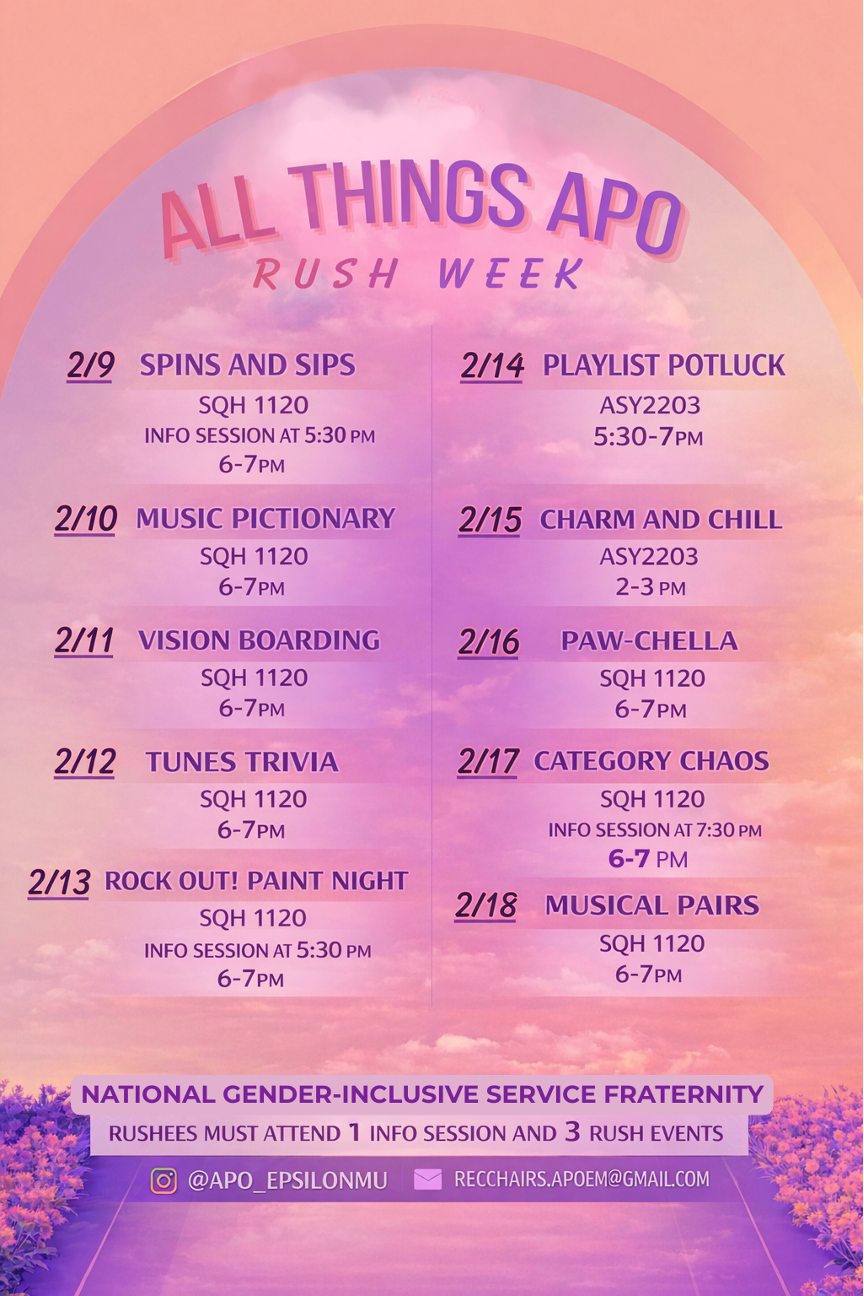 Fall Rush 2025 Rush Requirements: Attend 1 information session and 3 rush events to apply! Follow our instagram @apo_epsilonmu for updates